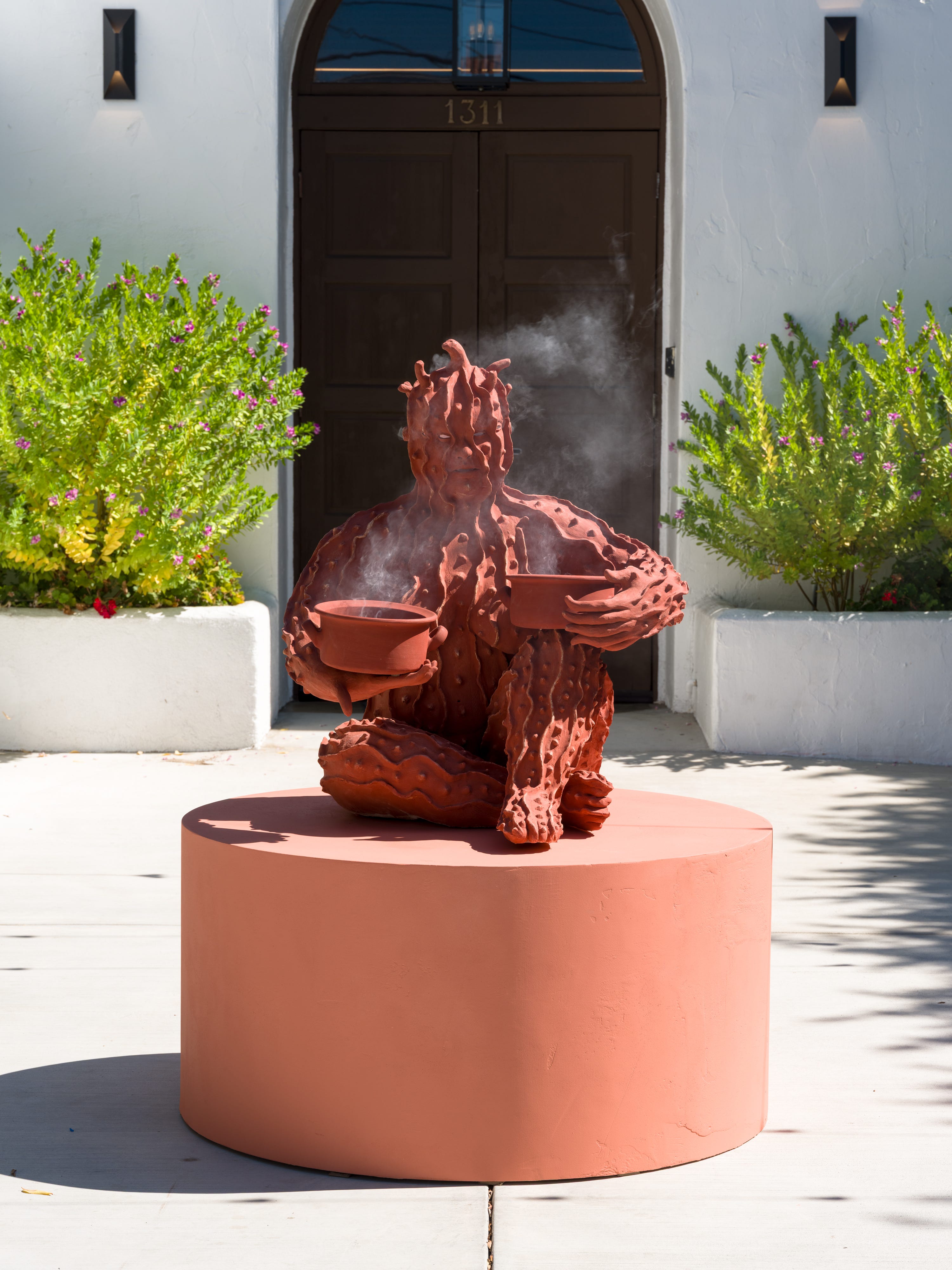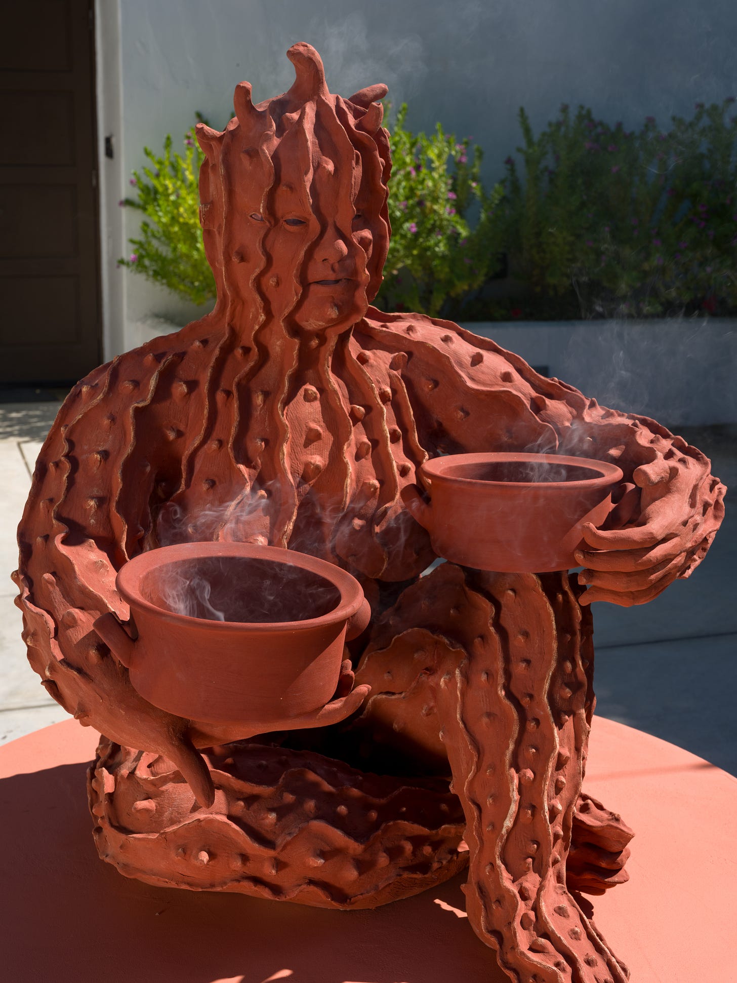 Upon entering the gallery, Bittergourd (2025) stood waiting—a terracotta sculpture of a woman’s body, her arms cupping two bowls that burned incense continuously through the day. The smoke traveled through the hollow of her form, winding upward before escaping through the carved crown of her head, filling the entryway in a slow, steady exhale. I stood still for a while, watching, breathing in the familiar scent of frankincense.