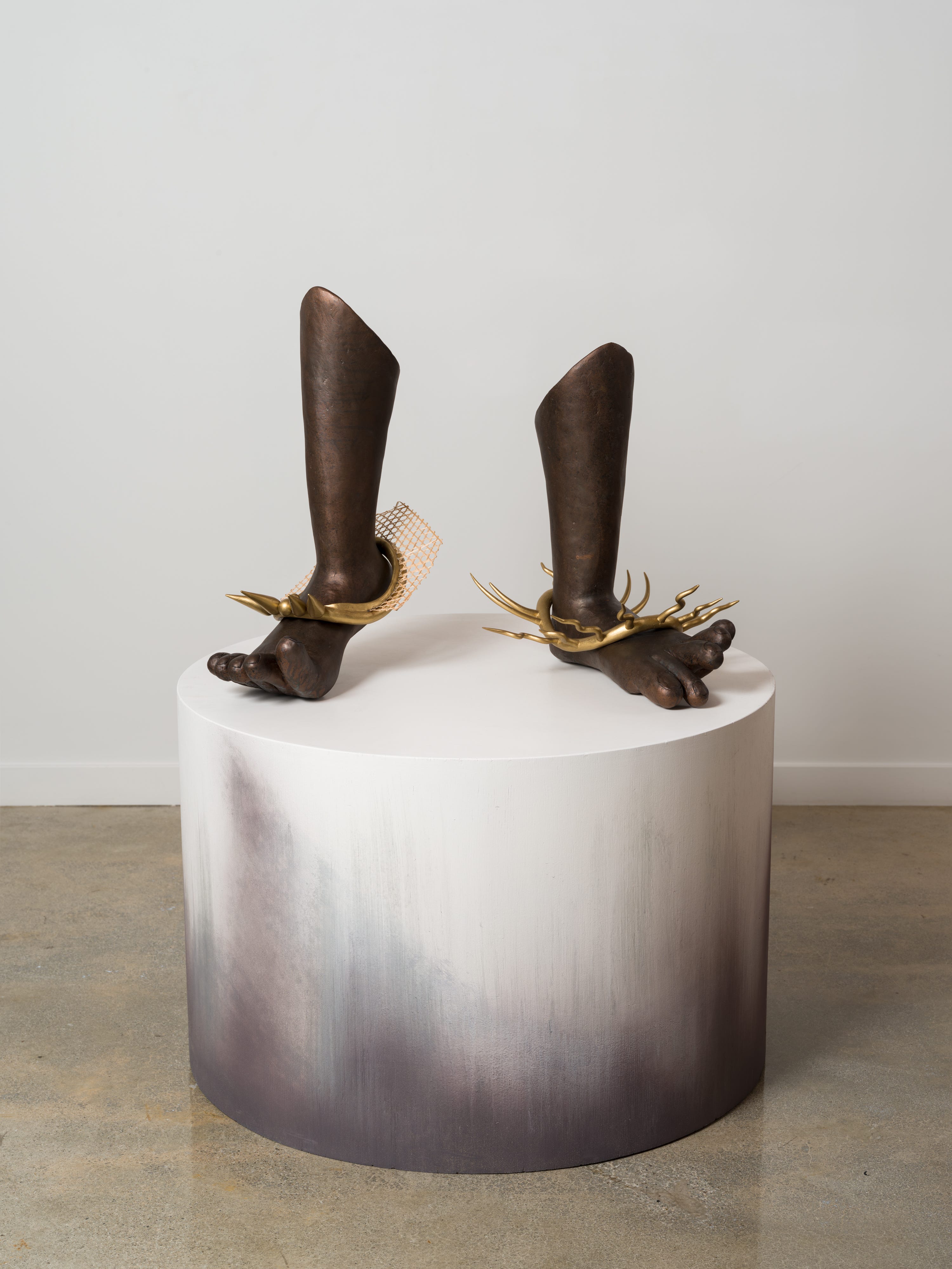 Then there are the sculptures Bangle (2025) and Dance Dance Revolution (2025), which reimagine the adornments of South Asian womanhood—our bangles, our anklets, our jhumkas—as artifacts of resistance. Bangle rests heavy with patinated bronze and wax, its surface cracked like sunburned earth. Dance Dance Revolution transforms the steel anklets of Sri Lanka’s Kandyan dancers into something both familiar and subversive: jewelry that gleams, but also guards.