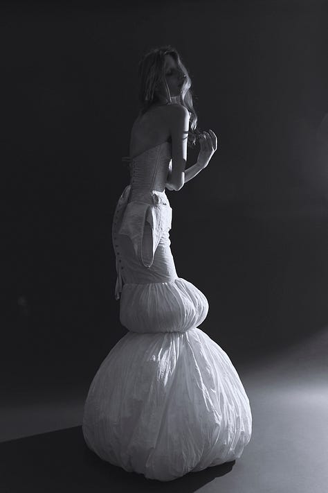 “I had people texting me who didn’t know that I worked on it, like, ‘Oh my God! Did she make this dress?’ Because they could see that signature shape that I do.” Lindsay Normington of “Anora” (and organizer of the first unionized strip club in the United States!) wore an all-white, structural ensemble to the Oscars, which contrasted sharply with a sea of black tuxes and the black stage. The dress clung with a gossamer-silk sheen, its two loose armholes drifting off the sides like a garment in the middle of being peeled away, echoing Erik’s fascination with clothes that seem to undress themselves and reveal what’s beneath. Its corset, tiny waist, and big geometric hips are emblematic of the brand’s dedication to diametric opposition. Erik added, “I loved it. It was the coolest moment for me ever, just that my work could be so recognizable.”